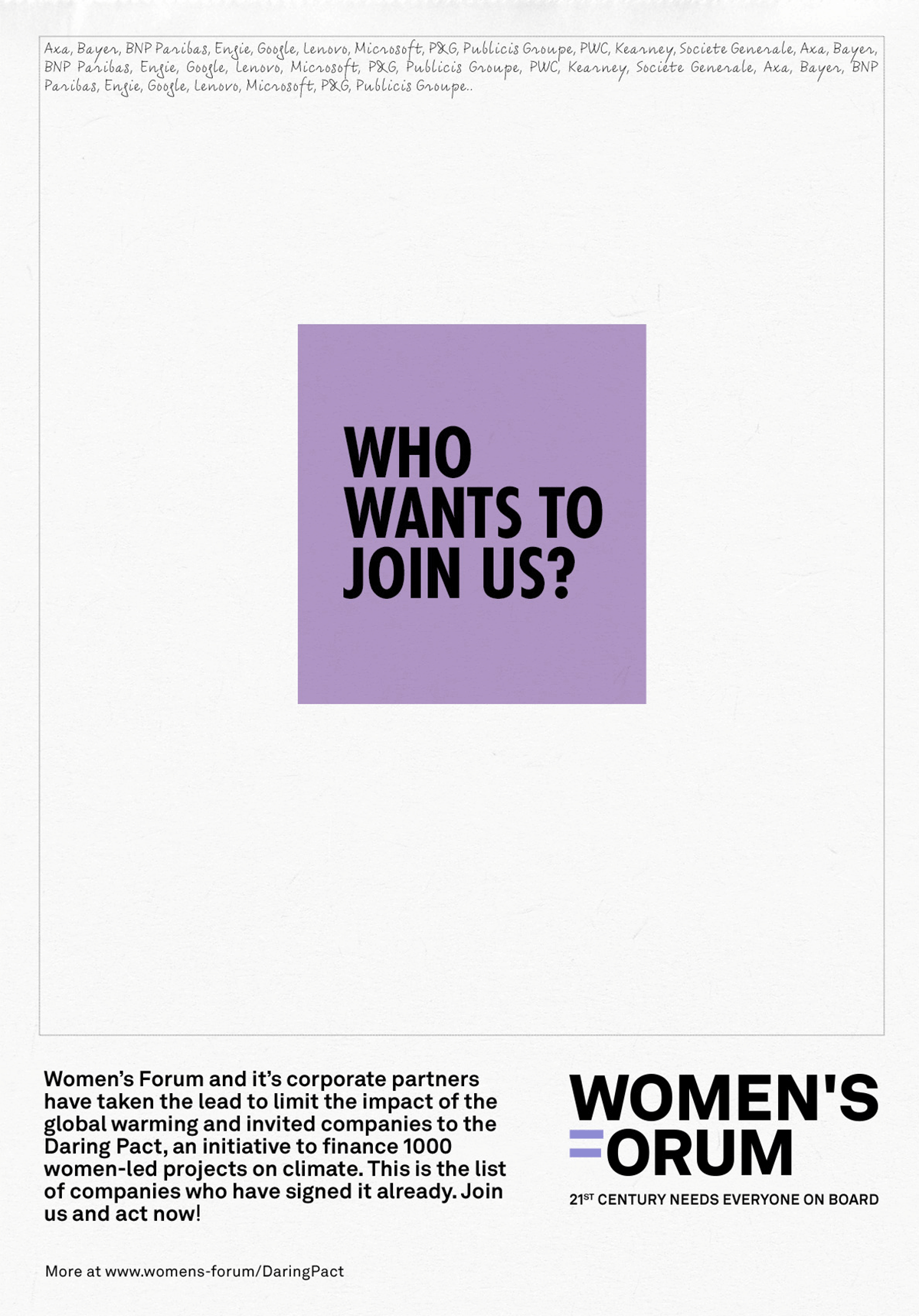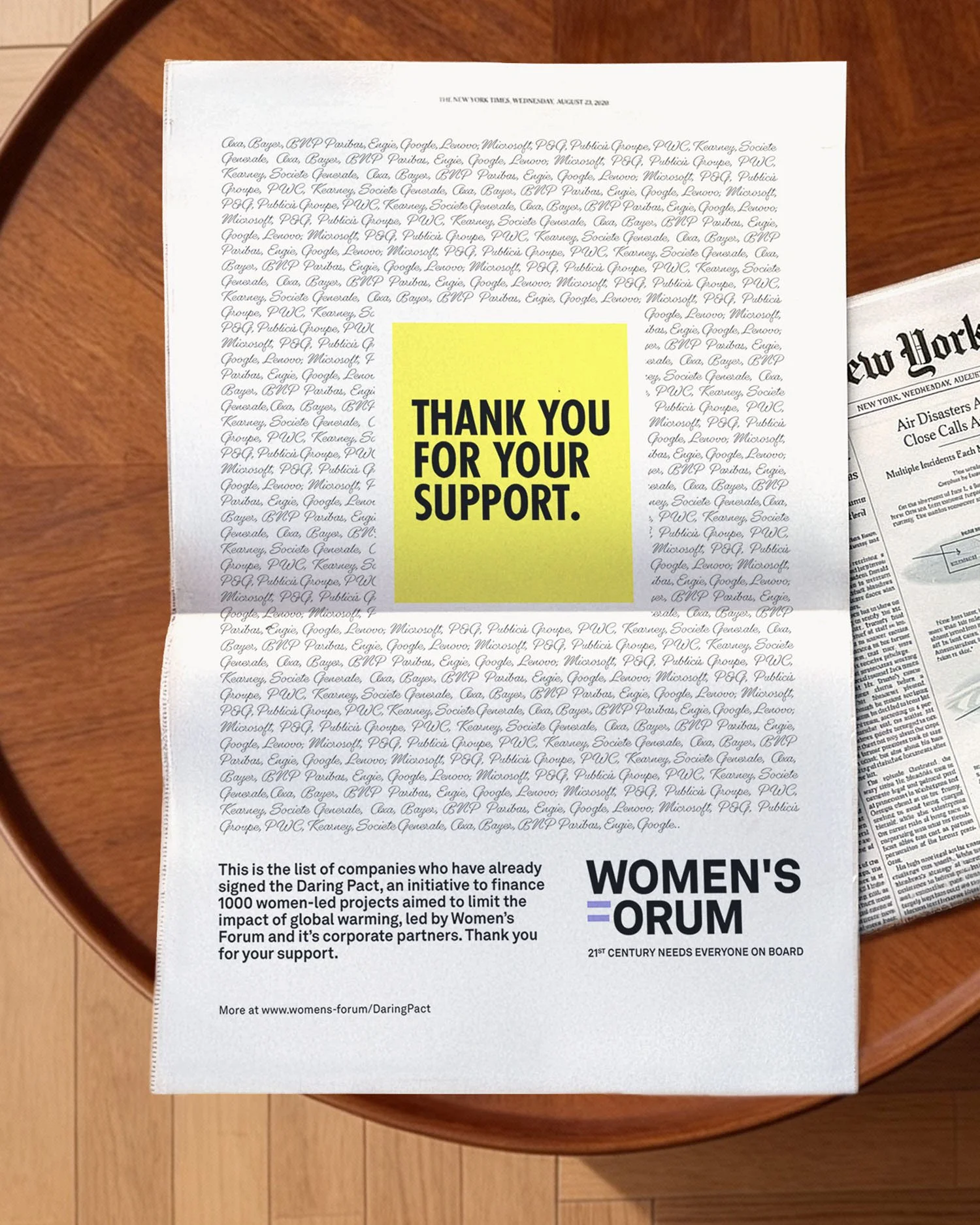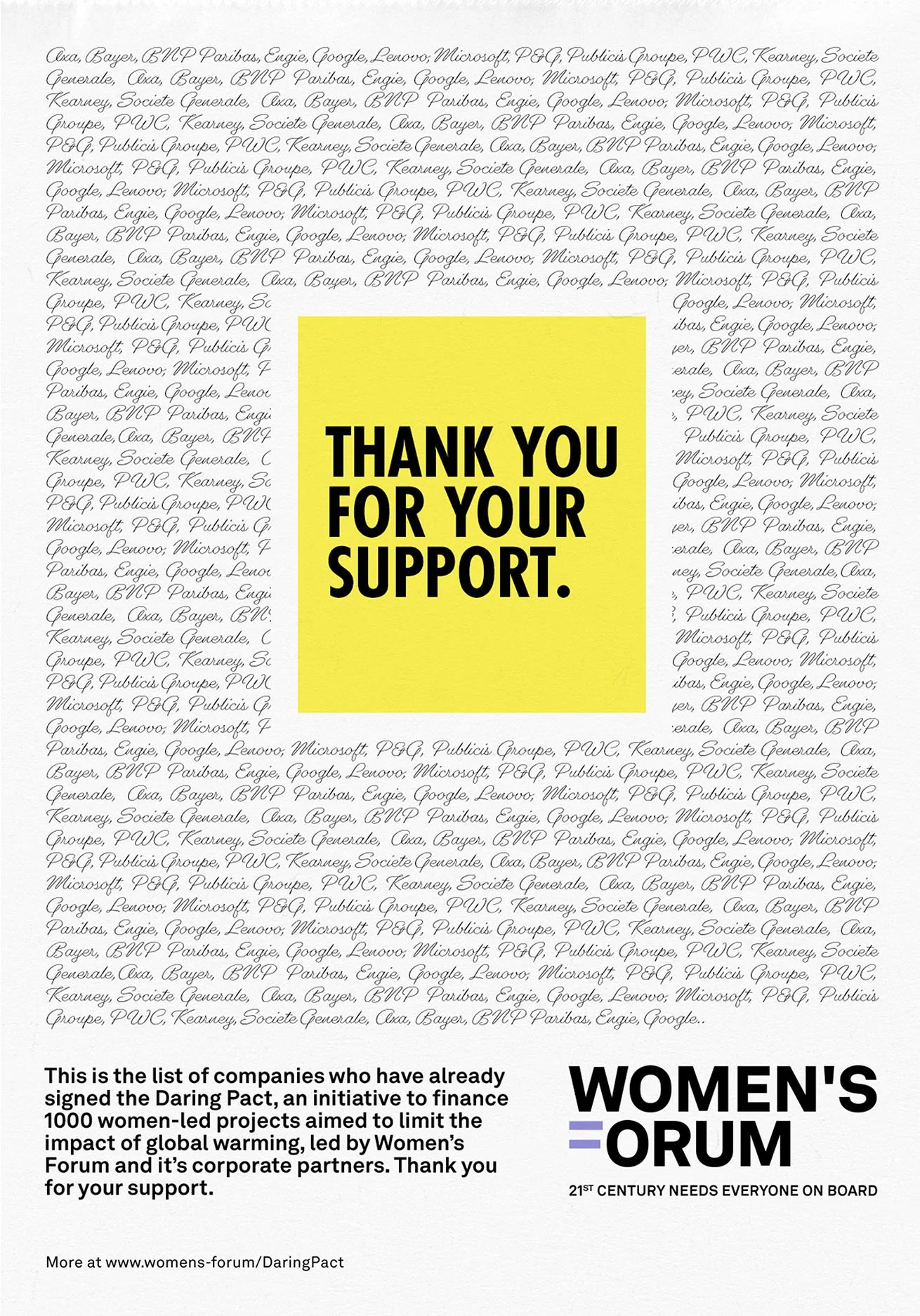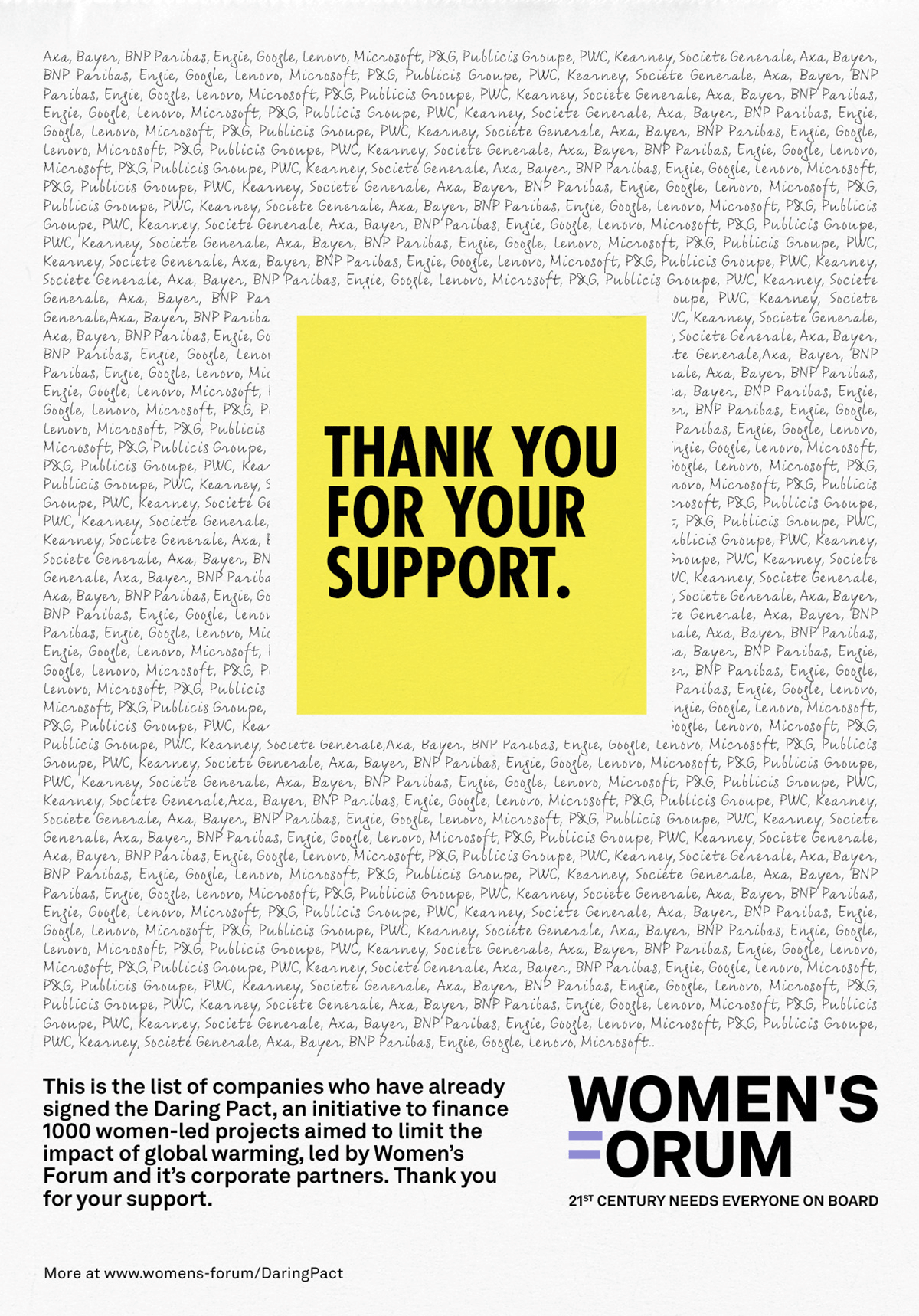 Later, a 'thank you' ad would appear with the list of the companies that have joined the Pact. All the companies' names would be written in the same way and without the logos to stress the Women's Forum inclusive and equal approach, where support from everyone matters, no matter the size or the power of the company.