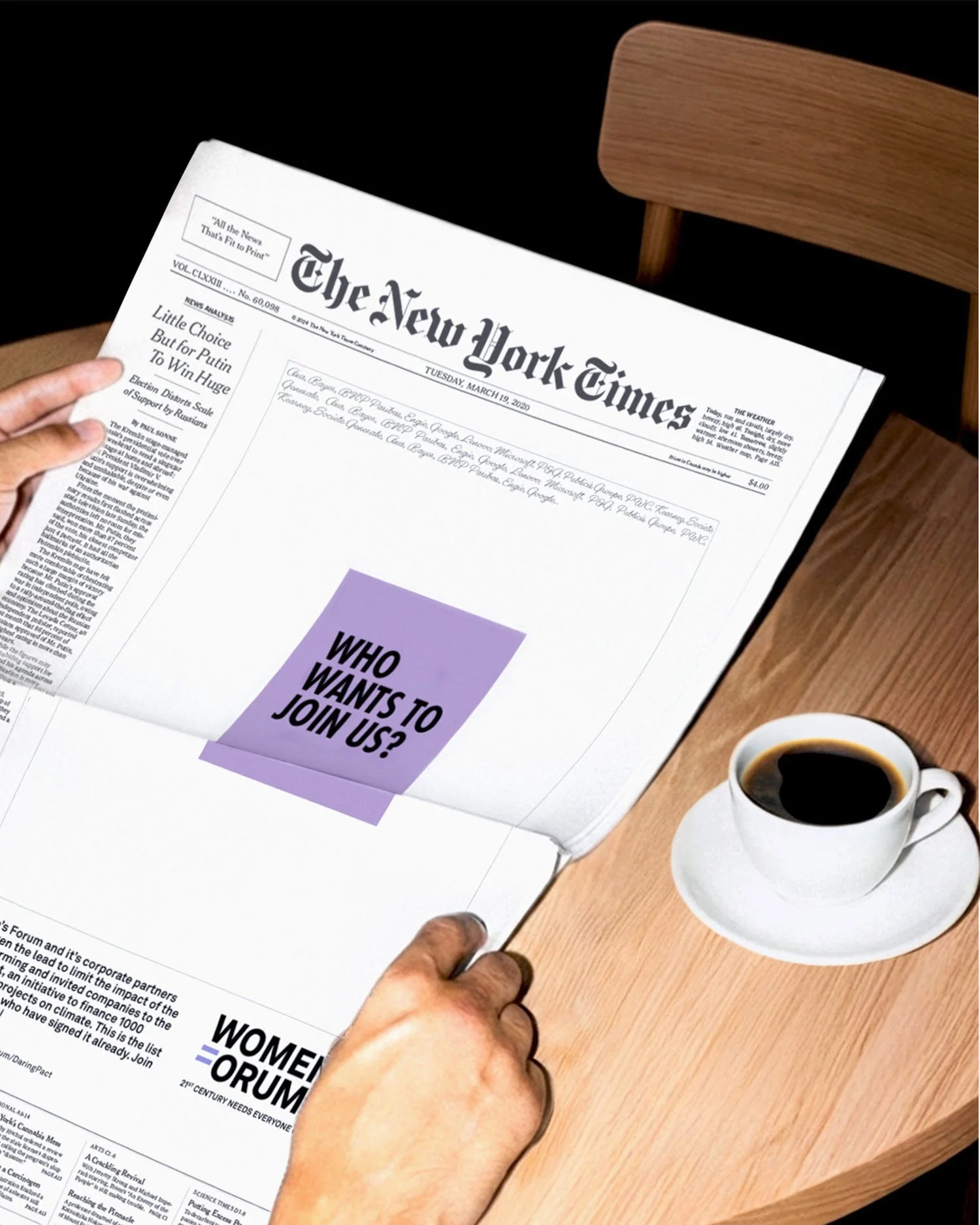 Inspired by the Anita Hill ad that appeared in the New York Times in 1991, in the rounds of two brand campaigns in press and social media the international business community would be invited to join the Women's Forum Daring Pact.