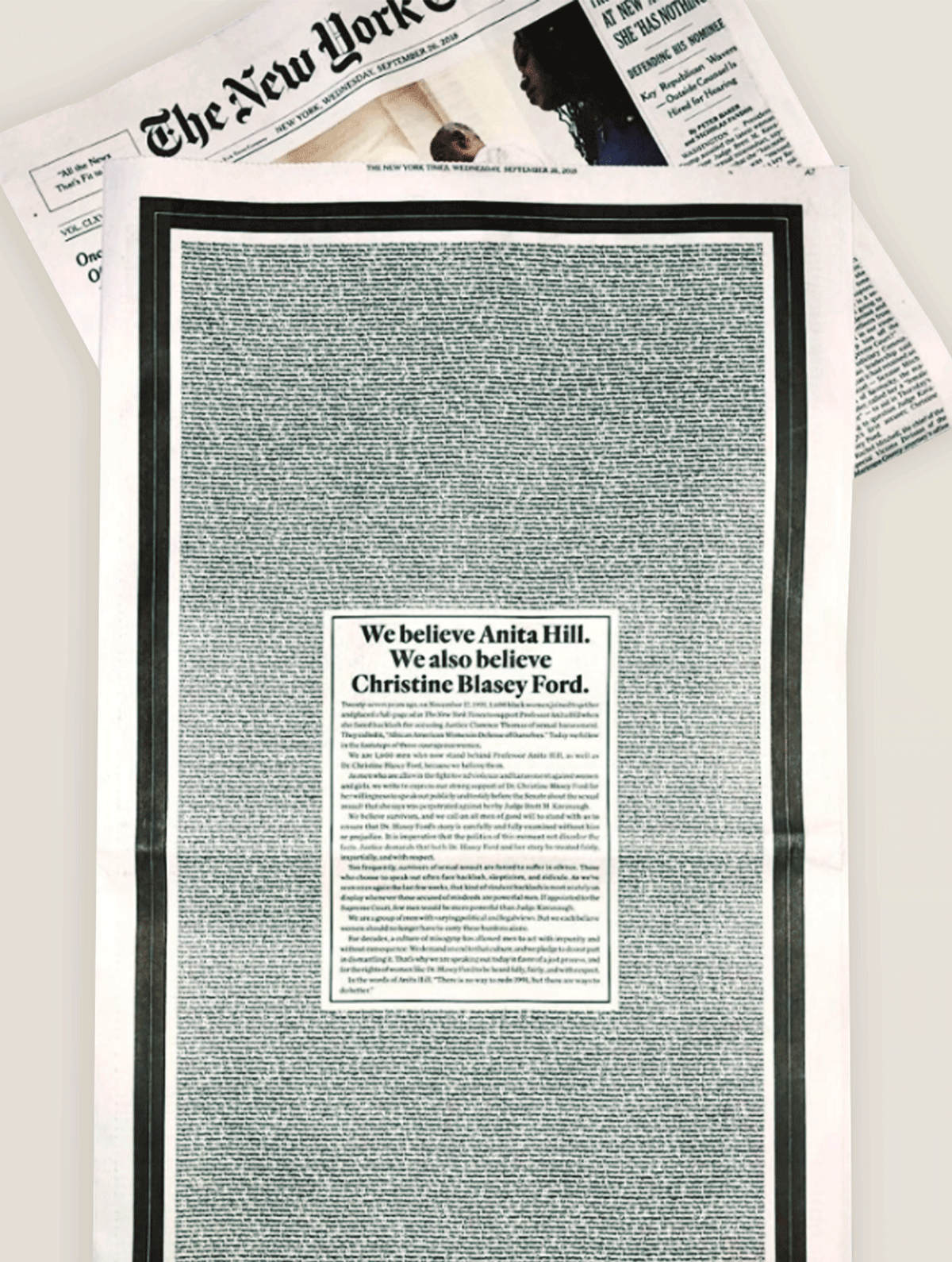 In 2018, a different ad in The New York Times appeared, that paid hommage to the Anita Hill initiative, this time with signatures or 1,600 men showing their support for Christine Blasey Ford, a sexual harassment survivor.